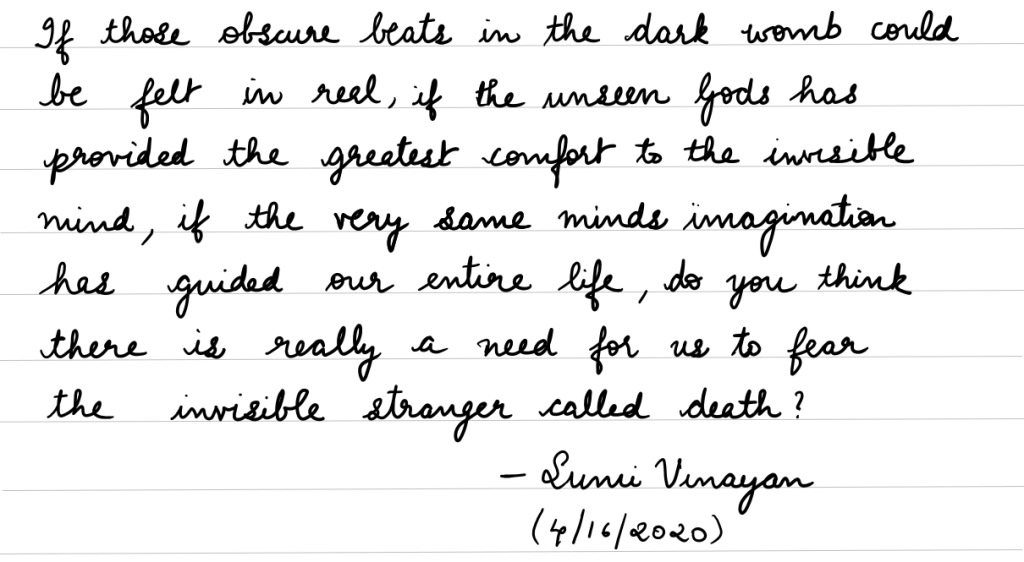 Beautiful thoughts Sumi. You have posed a good question. I think having a deep faith will definitely help. Keep writing…love your writing!